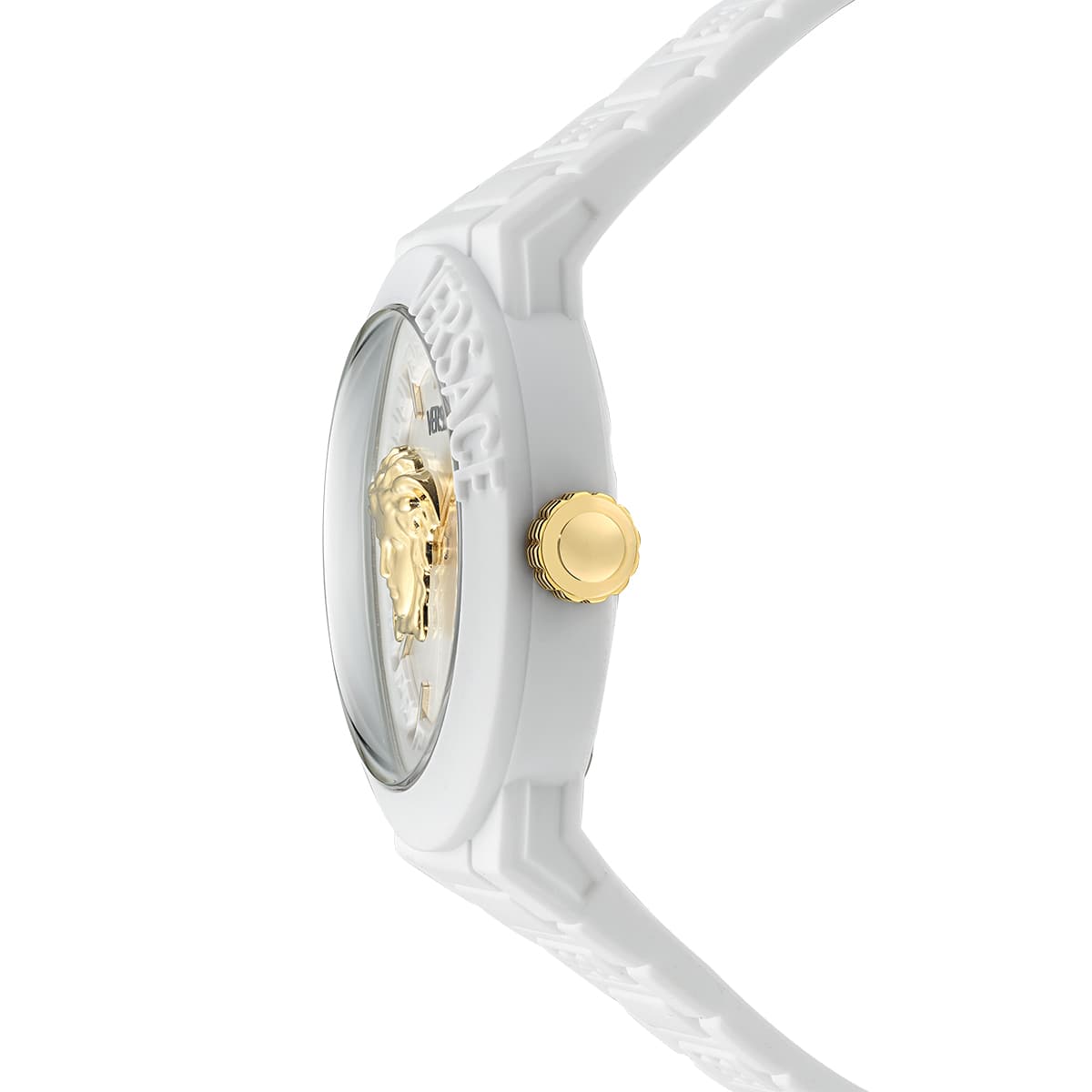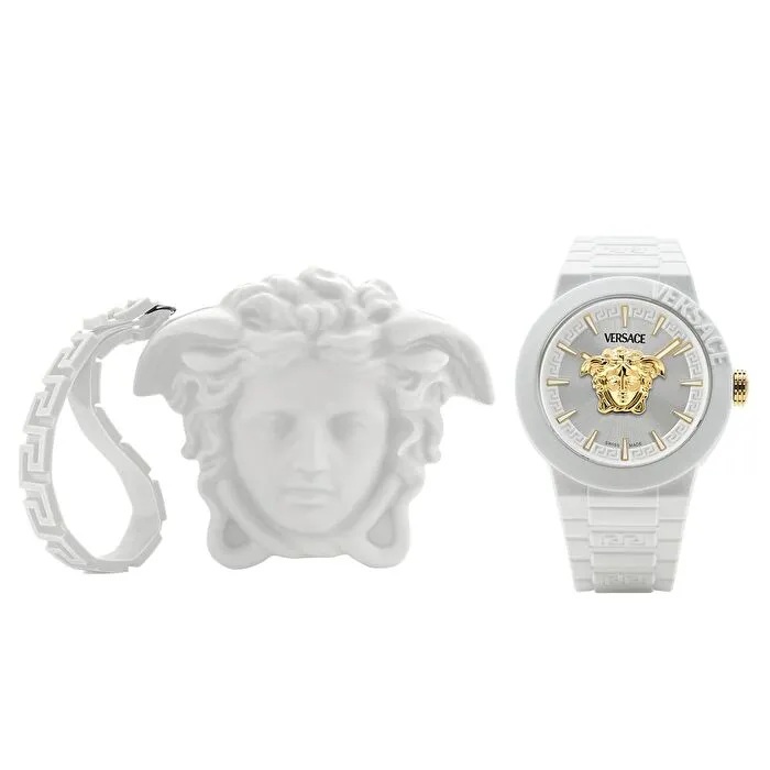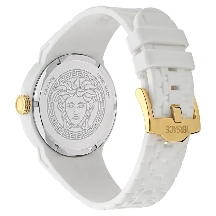 VRSCVEEFA0324 modeli, modern tasarımı ve dinamik detaylarıyla hem kadın hem erkek kullanıcılar için ideal bir seçim sunar. 43 mm çapındaki yuvarlak kasası, hafif silikon malzemeden üretilmiştir ve bilekte konforlu bir kullanım sağlar. Analog göstergeli beyaz kadranı, sade şıklığıyla dikkat çekerken; mineral cam yüzeyi çizilmelere karşı dayanıklıdır. İsviçre yapımı quartz mekanizması sayesinde zamanı hassasiyetle ölçer.