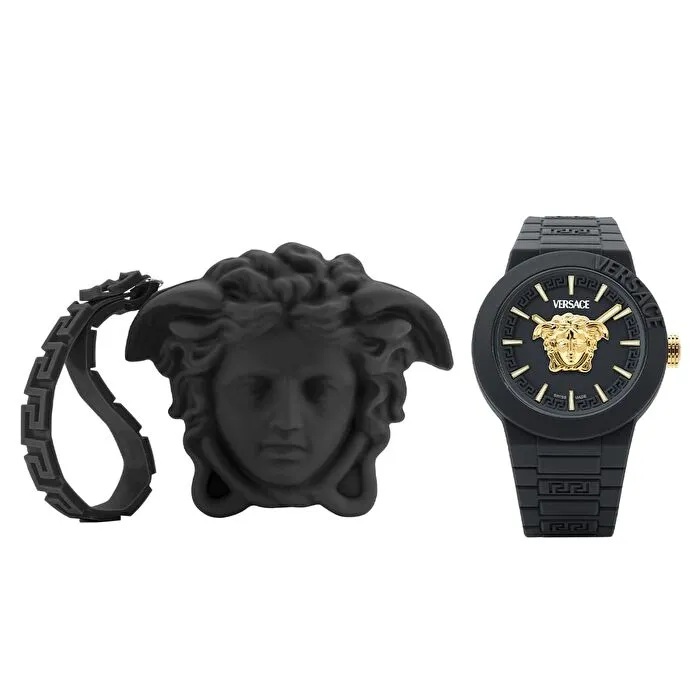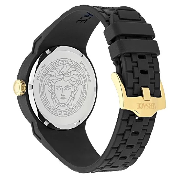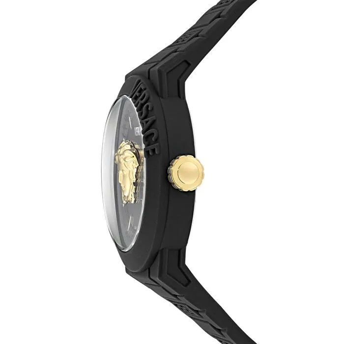 Kadran & Tasarım: Siyah mat kadran üzerine konumlandırılmış altın tonlu detaylar ve ikonik Medusa logosu, Versace’nin lüks tasarım dilini yansıtır.